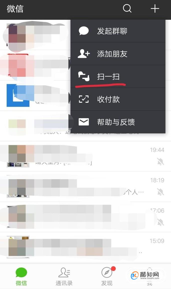 還有就是有小程序碼圖片的時(shí)候,我們可以打開(kāi)微信,點(diǎn)擊右上角的“+”,如下圖。